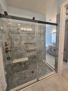 This elegant frameless shower door with matte black hardware is one of many custom designs we can do here at Florida Shower Doors. This shower is featuring 2 of our top selling doors, one being our frameless swing door and panel and the other showing our frameless bypass door. Call our office now for a FREE quote at 941-786-1437 or submit a quote request here (Get a Quote Now! – Florida Shower Doors) on our website!